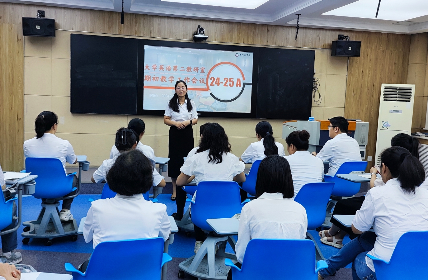 在新学期即将开始之际,外国语学院大学英语第二教研室全体教师于8月29日上午在W104召开了期初教学工作安排会议。此次会议由大学英语第二教研室主任王霞老师主持,旨在总结以往教学经验,展望未来大学英语持续改革,确保新学期工作的顺利开展。