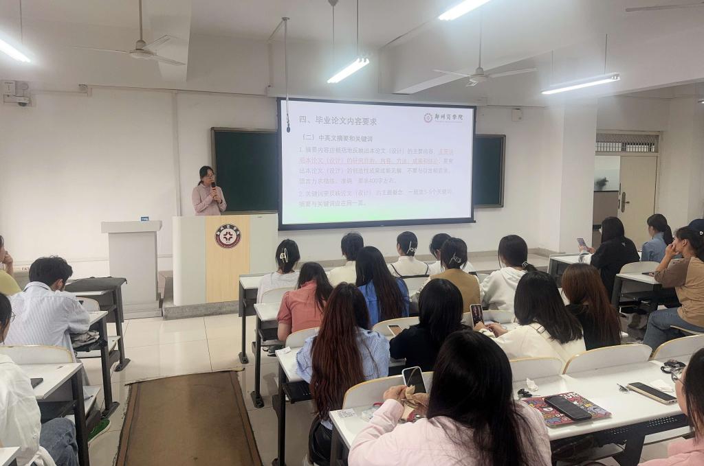 会议上,赵院长首先讲解了毕业论文的课程属性与对人才培养目标的支撑关系,又结合毕业论文平台审核要求强调了毕业论文的重要性与严肃性。他指出,毕业论文不仅是大学四年学业综合体现,也是培养学术思维、科研素养、语言表达能力等多种能力的过程,毕业论文从选题到答辩,都应保持虚心与严谨的态度,严格遵守学术诚信,多请教多修改,高标准完成论文工作。