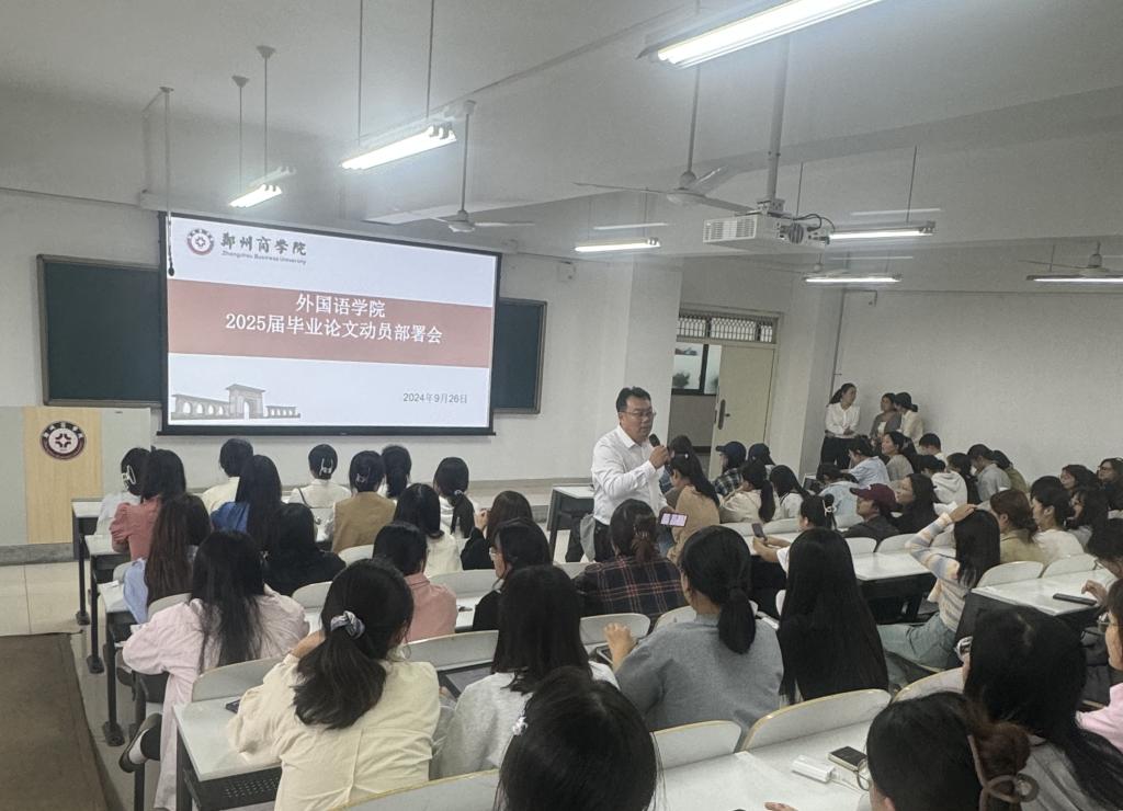 为提高2025届本科毕业论文质量,实现人才培养目标,外国语学院根据学校关于2025届毕业论文(设计)工作指导意见,于9月26日在广恩楼211召开了2025届毕业论文动员大会,就毕业论文重要性、毕业论文撰写态度、学术诚信、论文撰写注意事项等进行讲解与部署。出席会议的有外国语学院副院长赵保成、学院毕业论文负责老师彭艳华、各专业论文负责老师、辅导员以及全体2025届在校毕业生。