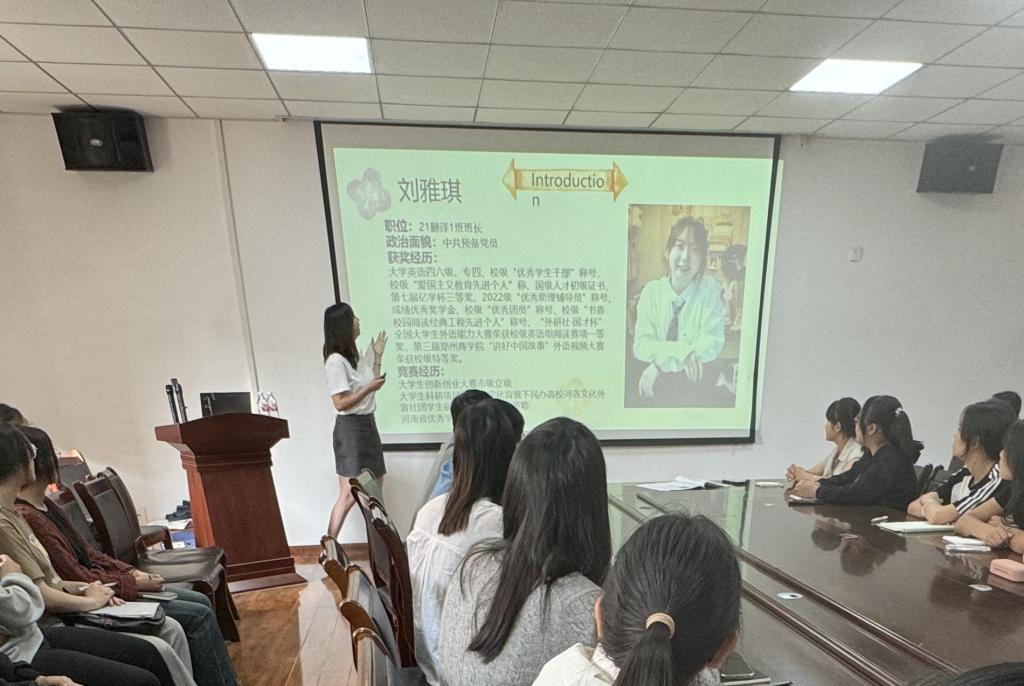 见面会第三个环节是优秀学长学姐分享会。21级翻译1班刘雅琪同学结合自身经历讨论了如何才能让自己变得优秀的问题,建议新生积极尝试,享受过程,专注课堂,以结果为导向,努力奋斗,查漏补缺;22届毕业生郭涵同学以视频的形式为新生分享了自己做外贸工作的一些心得体会,告诉新生要提高执行力,不断积累沉淀自我,深耕学习,为未来求职提前做好准备。22届毕业生岳家旭也以视频的形式给新生加油,鼓励大家努力学习,争取毕业时能像他一样出国留学深造。