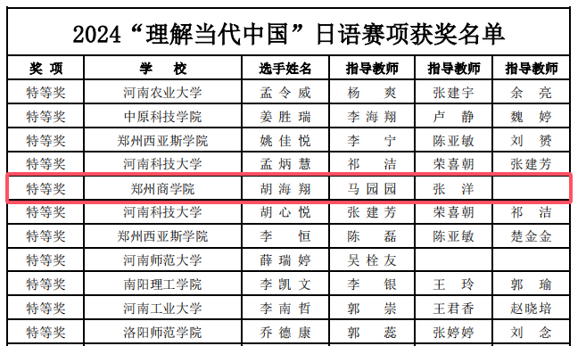 11月11日,2024“外研社·国才杯”“理解当代中国”全国大学生外语能力大赛多语种组省赛成绩公布,我院日语专业4名学子在比赛中以扎实的外语综合能力和丰厚的文化素养在省赛中取得了优异成绩,其中22日语1班胡海翔获得特等奖,晋级国赛。