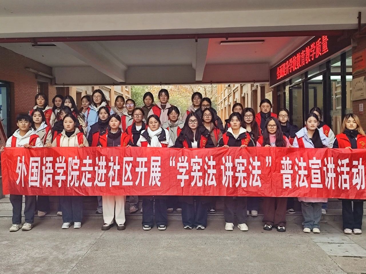活动伊始,志愿者们在外语楼前集合并拍照,由负责人统一带领前往学院路社区。随后,志愿者在社区举办宪法宣讲会,详细地讲解宪法的基本知识和重要内容以及现实意义,并通过案例分析帮助社区居民更好地理解宪法在实际生活的运用,提高大家的法律意识。活动最后,志愿者们在社区为过往的社区居民发放宣传资料,并为存有疑问的居民进行详细解答。在此次活动中,志愿者们不仅提升了法律素养,还增强了法治意识,同时社区居民也提高了法律意识与适用能力。