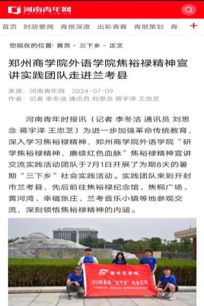 据悉,此次“研学焦裕禄精神,赓续红色血脉”焦裕禄精神宣讲活动由外语学院焦裕禄精神宣讲实践团队统筹策划,旨在传承并弘扬红色精神,从焦裕禄精神中获得心得感悟,激发奋进力量。活动过程中,我院学子研习并走访了焦裕禄纪念馆、黄河湾、幸福张庄、焦裕禄干部学院、焦桐广场和音乐小镇,在那里团队成员实地领悟到了焦裕禄精神所蕴含的艰苦奋斗、无私奉献、科学求实的精神内核,进一步认识到传承红色精神是青年无比光荣的使命。