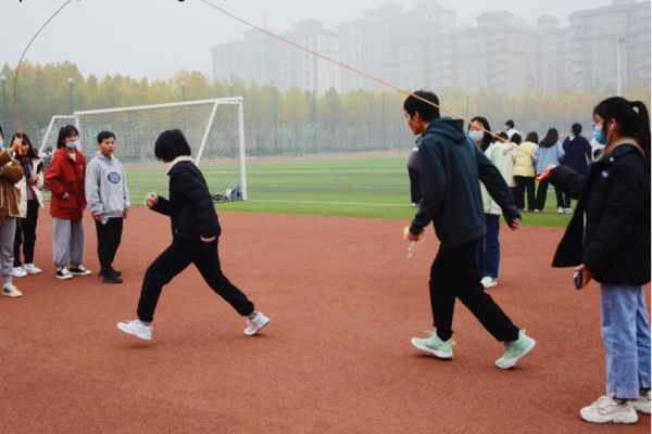 团体跳绳:哨响过后,参赛选手跟随绳子落地的节奏顺次从绳上跃过,矫健的身姿、不间断的跳跃展现了同学之间强大的默契。观赛的同学们呐喊声、加油声此起彼伏,将比赛氛围推向了高潮。