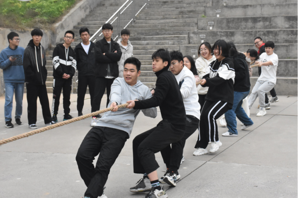 拔河比赛:随着裁判一声哨响,队员们顿时火力全开,双手紧握绳子,马步站开,卯足了劲,涨红了脸,齐心协力使劲往后拉。僵持阶段,大家毫不退却,咬紧牙关,坚持到底,现场呐喊声、加油声此起彼伏。