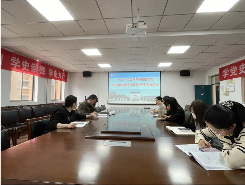 为进一步贯彻落实学校疫情防控和学生安全稳定各项工作安排,维护校园安定和谐,确保学生在校期间的安全。5月14日上午,外语学院组织召开安全稳定暨特殊学生分析研判专题会。学院党委书记王克志、团委书记张文娟及全体辅导员参加会议。