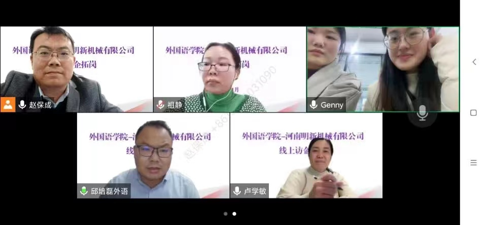 为深入推进访企拓岗促就业专项工作,持续深化校企合作,拓宽实习实训渠道和资源,促进毕业生高质量就业,11月20日—11月21日,外国语学院院长邱培磊、副院长赵保成、实习指导老师祖静、卢学敏通过腾讯会议举行系列“访企拓岗促就业”线上交流会。阿里巴巴巩义区域负责人汪胜利、钟学茂,河南省明新机械制造有限公司经理郭红云,实习生何玉格分别参会。