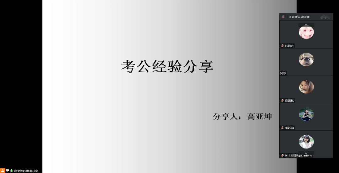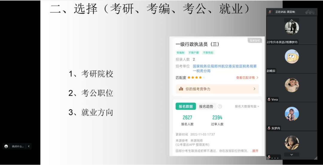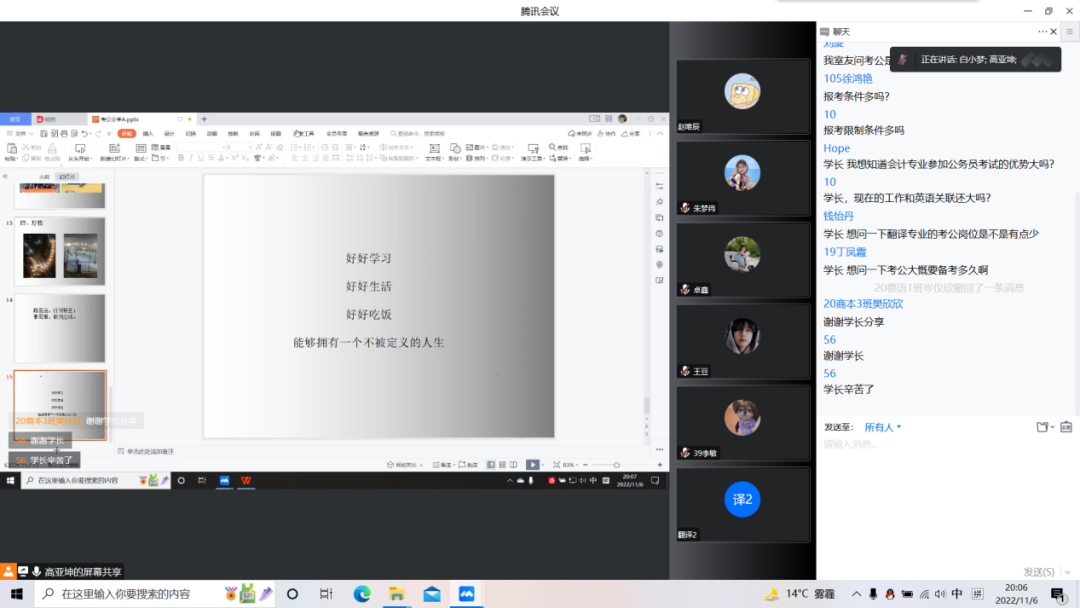 2022年11月6日下午,我院校友讲坛第二讲——考公经验交流分享会以线上会议形式顺利召开。本次讲座由beat36518级英语专业优秀毕业生、现就职于确山县新安店镇人民政府党政办综合办公室的高亚坤为同学们分享公考成功的学习经验,19级、20级学生以及毕业班辅导员老师参会。
