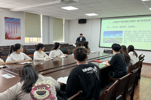 5月10日下午,外语学院学生第三党支部在W209会议室开展学习《中国共产党纪律处分条例》主题活动。本次学习由支部书记丁震霆带领全体党员学习《中国共产党纪律处分条例》,解读条例重要内容,并通过实际案例深入剖析了违反党纪党规的严重后果。同时观看《中国共产党纪律处分条例》讲解视频,让支部成员更全面地了解党的纪律建设,深刻感受党纪严明对于党的事业发展的重要性。