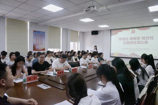 为深入学习贯彻习近平总书记关于党纪学习教育的重要讲话和重要指示精神,5月28日下午,我院于外语楼209会议室举办“学党纪 明规矩 强党性”主题微党课比赛。我院团委书记王子浩、组织委员刘宁、学生第一党支部书记陈春燕、学生第二党支部书记兰敬高、学生第三党支部书记丁震霆、学生第四党支部书记袁媛担任评委,全体学生党员共同参加。