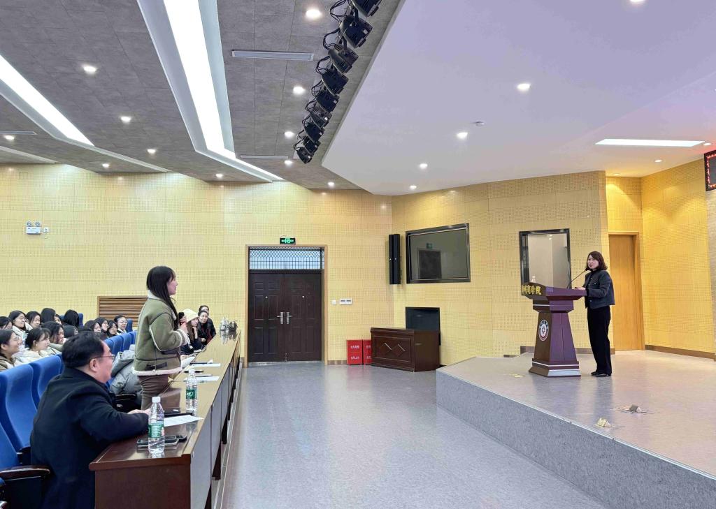 12月7日上午,我院23级英语专业认识实习的第二场讲座在西校区自立楼报告厅举办。郑州市中原区伏牛路小学孙艳校长应邀出席并为同学们带来了一场主题为“从实习到就业:踏上杏坛的实战秘籍”的精彩讲座。孙校长围绕英语专业的特色优势,向广大学子深入剖析了提前规划职业生涯的重要性,特别是针对如何成长为一名杰出的英语教师提供了详尽指导。孙校长紧扣教育发展的时代脉搏,引领学生们深刻洞察教育领域的新兴趋势,并巧妙地将实习内容与具体教学实践案例相结合,生动诠释了英语专业学生在实践中如何逐步累积教学经验、精进教学技艺,为学子们指明了方向。