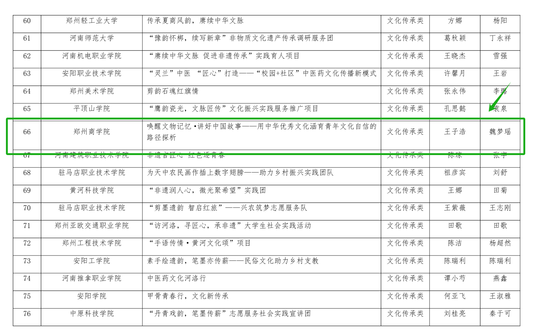 日前,河南省教育厅官网公布《河南省教育厅关于公布普通高等学校“出彩中原”大学生社会实践活动项目立项、结项及等次评定结果的通知》教学〔2025〕14号。我院申报的《唤醒文物记忆·讲好中国故事——用中华优秀文化涵育青年文化自信的路径探析》项目成功立项。