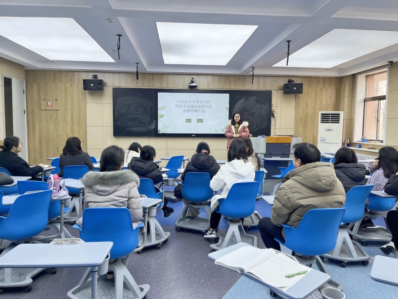 2023级大学英语文科四级考试通过情况分析及新学期计划报告会于3月4日下午在W104顺利举行。会议由宣菡静主任主持,张平丽老师主讲,旨在总结2023级学生在大学英语四级考试中的表现,并为新学期的英语学习制定详细计划。