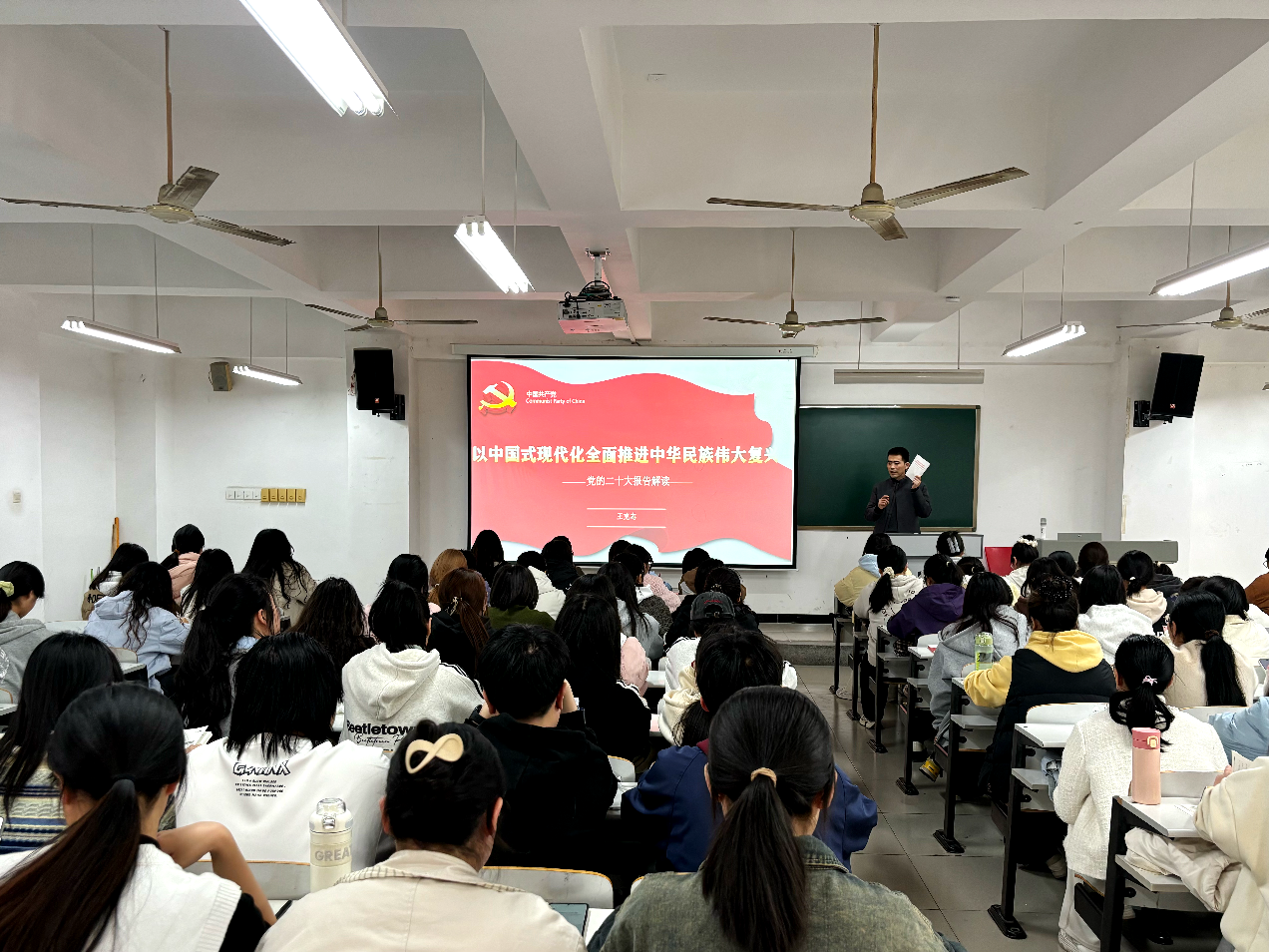 党课开班仪式结束后,王书记以“以中国式现代化全面推进中华民族伟大复兴”为题展开党课第一讲,从“总体框架及其逻辑、论断,主题结构及其亮点,新思想及其深层逻辑”等三个角度对党的二十大报告展开了深入解读。授课中,王书记通过理论与案例相结合的方式,系统阐述了中国式现代化的科学内涵与时代意义,并号召青年学子坚定理想信念,加强党性修养。