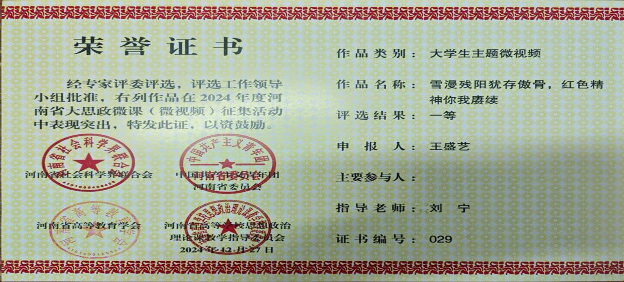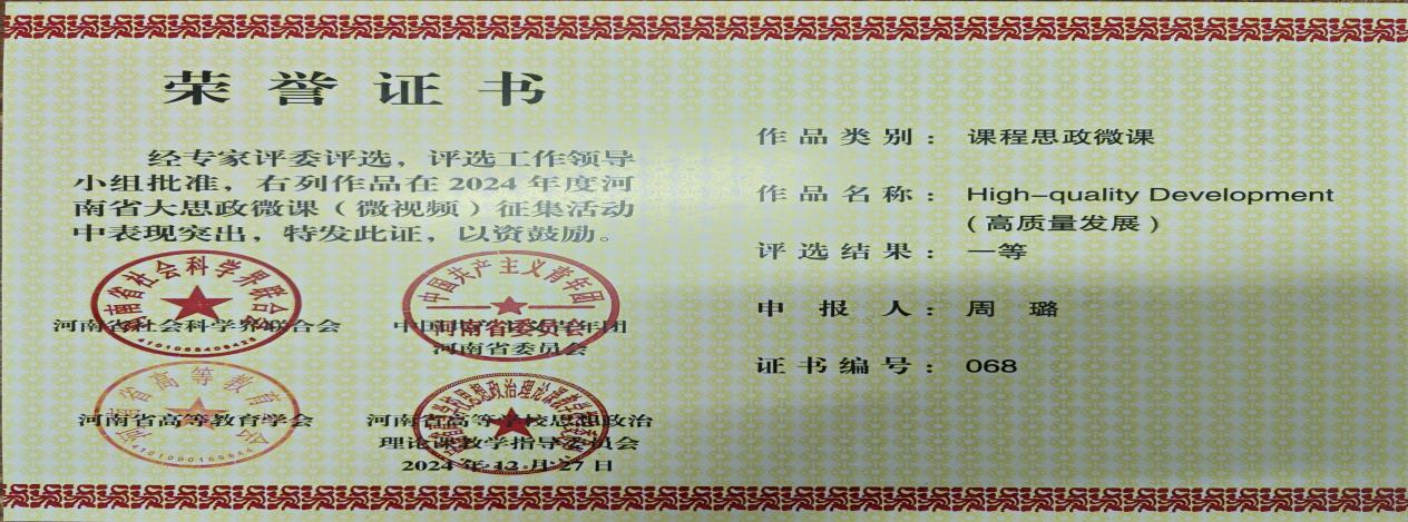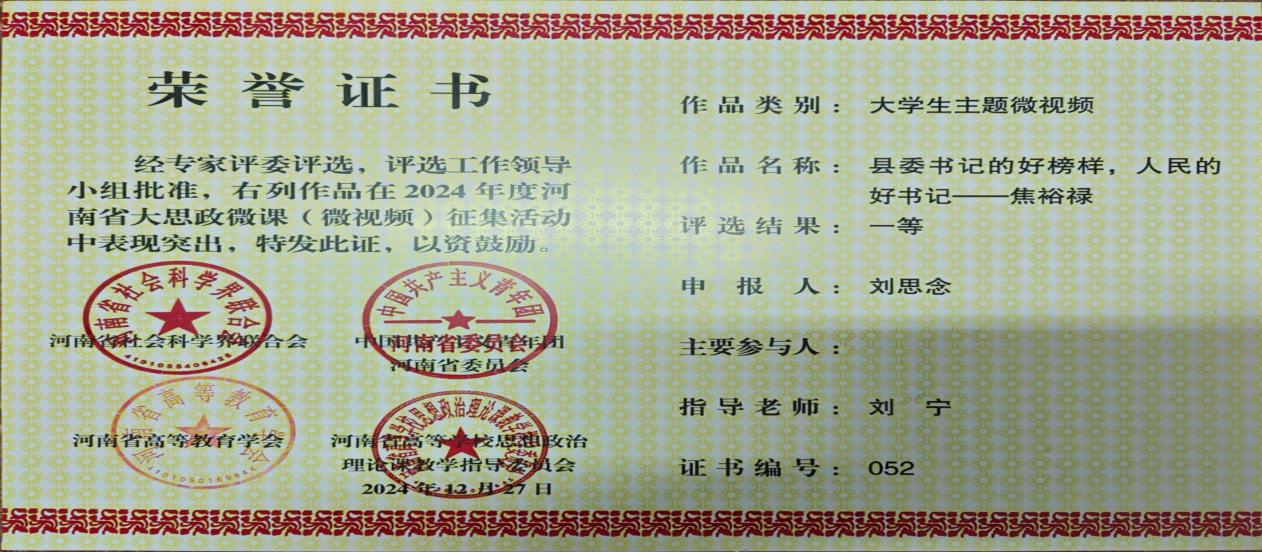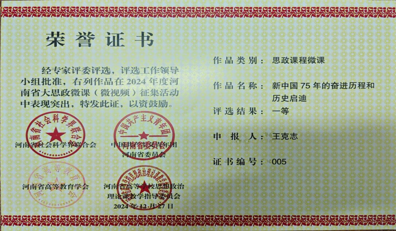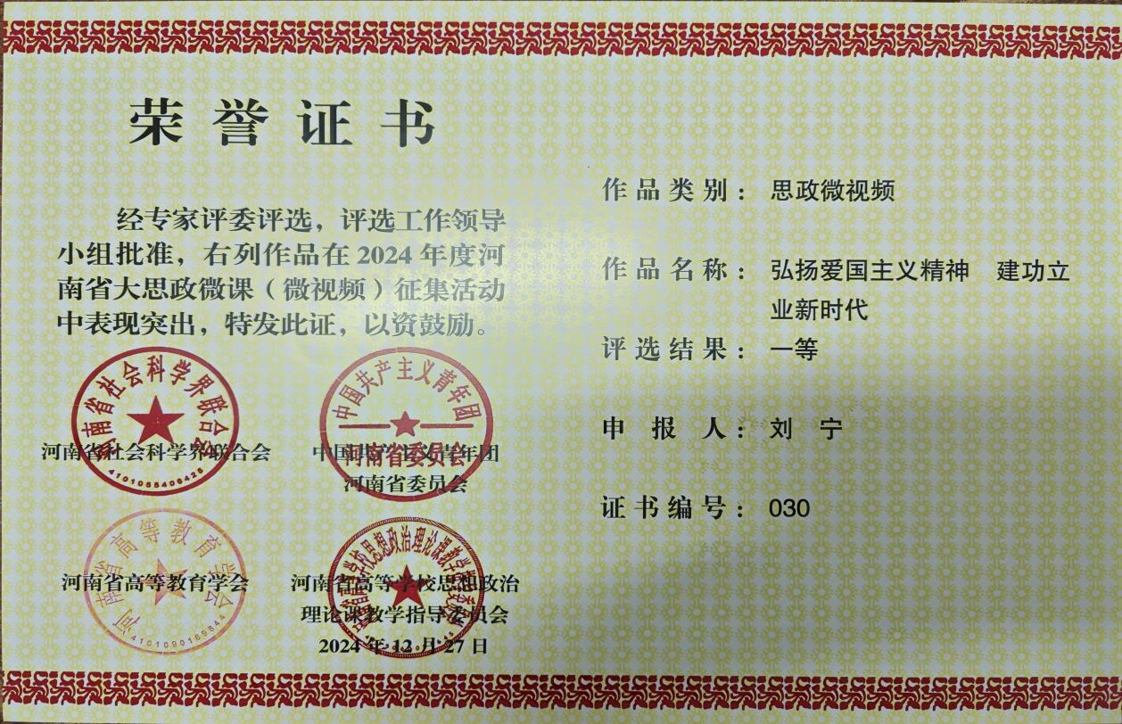 近日,河南省社会科学界联合会、共青团河南省委员会、河南省高等教育学会、河南省高等学校思想政治理论课教学指导委员会联合发布《关于公布2024年度河南省大思政微课(微视频)征集活动评选结果的通知》(豫社科联字〔2024〕19号)。我院在此次活动中共斩获思政课程微课1项、课程思政微课1项、思政微视频1项、大学生主题微视频2项,均荣获一等奖。