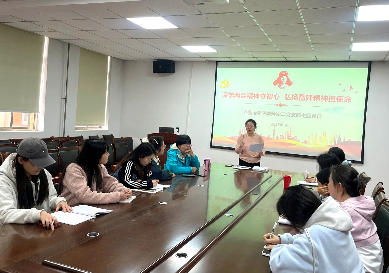 3月27日,外国语学院教工第二党支部开展了“深学两会精神守初心,弘扬雷锋精神担使命”的主题党日活动,全体无课教师党员参加了此次活动。