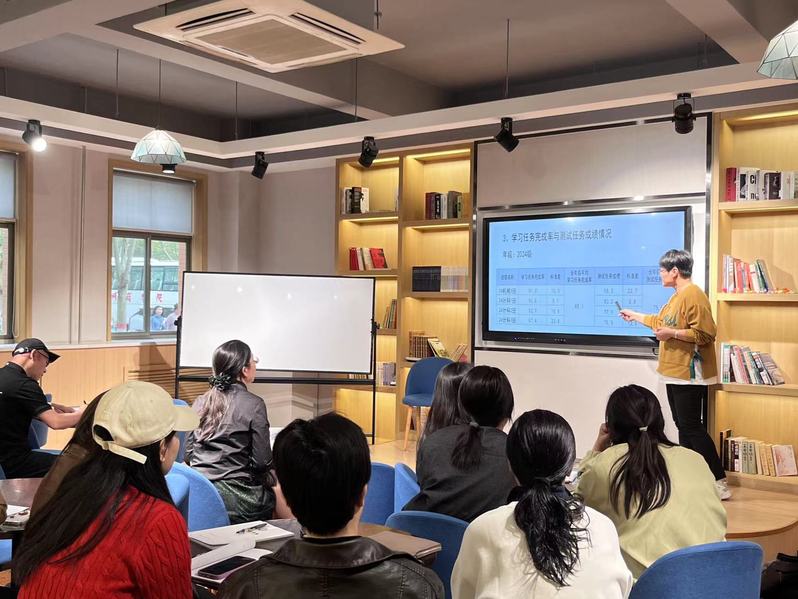 首先,理工24级课程组闫锐老师进行了大学英语线上平台使用效果的分享。闫老师在智慧化教学赋能大学英语的趋势下,以线上平台为英语教学的辅助手段,将线下学习与线上学习有机融合。每周在微信公众号“词达人”上发布三个与课文、四级和思政有关的词汇任务;单元结束后在iTEST上各发布一次词汇检测和翻译练习;每周在FiF上发布两个与课文主题相关的朗读任务和四级真题听力任务;每单元结束在iWrite上发布一次作文并鼓励学生根据修改意见多次修改。
