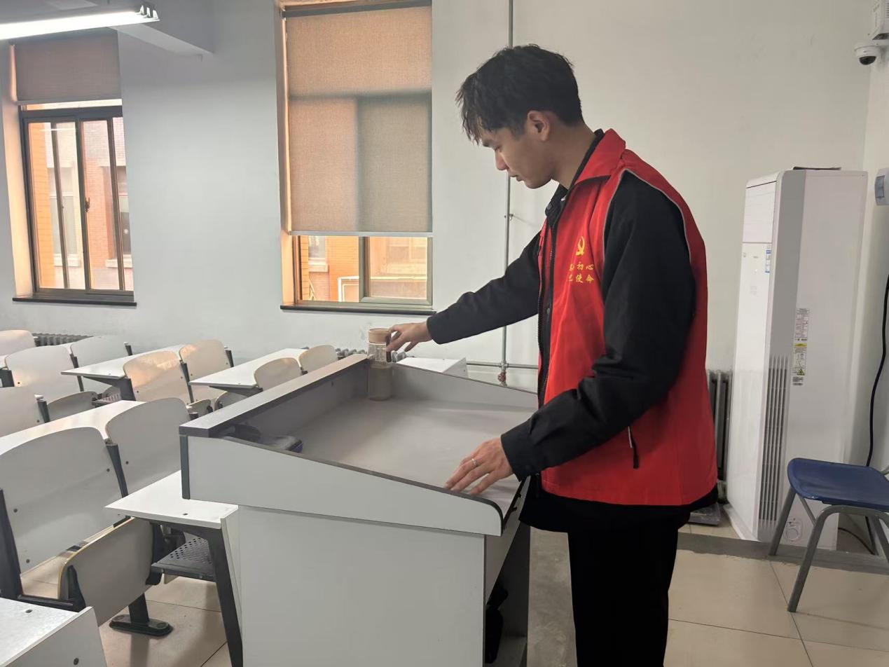活动伊始,劳动教育专项负责老师靳珊对本次清扫工作提出具体要求:一是重点清理公共区域卫生死角;二是规范整理各教室劳动工具;三是全面检查消防设施安全。随后,志愿者们分组行动,有的负责清扫楼道、擦拭门窗,有的整理教室劳动工具、清理讲台杂物,还有的负责打扫导员办公室,确保每个角落干净整洁。同时,志愿者们还对消防设备进行了细致检查,确保设施完好可用。