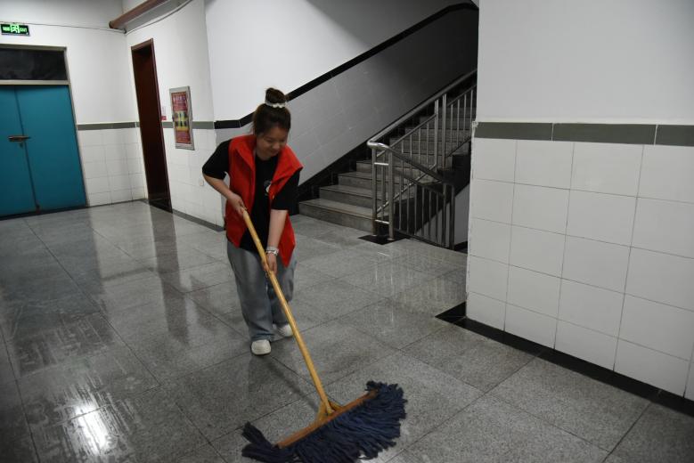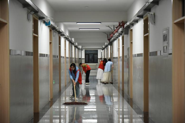 大家分工明确,有的手持扫帚清扫地面的灰尘与杂物,有的拿着拖把拖地板,还有的用抹布仔细擦拭水房的洗脸盘和走廊的墙砖。在水房,志愿者们针对脸盆等污垢进行了深度清理,确保了环境的整洁。经过志愿者与学生的辛勤劳动,宿舍的公共区域焕然一新。