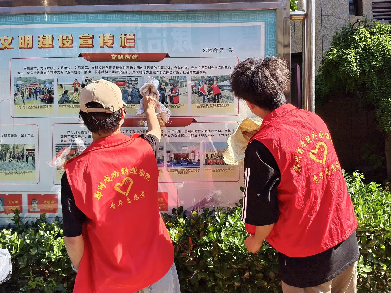 活动伊始,志愿者们热情高涨,在活动负责人的带领下来到学院社区,随后,社区负责人强调了本次活动的意义,并分配活动各项任务。志愿者们迅速按分工有序开展工作。一部分志愿者组成公共设施清洁小组,对社区内的健身器材、休闲长椅、宣传栏等公共设施进行全面清洁与维护。他们用抹布仔细擦拭,让公共设施焕然一新。还有一部分志愿者组成文明宣传小队,深入社区向居民发放文明环保宣传手册,耐心讲解垃圾分类、文明养宠等知识,倡导大家从身边小事做起,共同爱护社区环境。活动最后,社区负责人对志愿者们的辛勤付出表示衷心感谢,肯定大家用实际行动为社区环境改善与文明风尚传播贡献力量,鼓励同学们继续践行劳动精神,让志愿之光点亮更多角落。