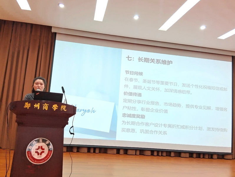 接着,外贸组长张亚芳老师以“客户开发渠道与跟进”为主题进行讲授,围绕跨境营销中客户开发的主要渠道及客户跟进的具体细节进行了细致讲解,使学生认识到跨境营销中客户关系管理的重要性,加深了学生对跨文化商务交际的理解和客户管理的认识。