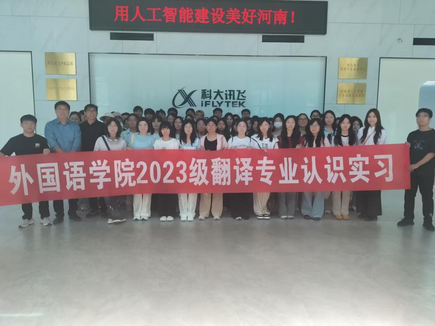 5月12日,在郜万伟、张明慧两位教师带领下,68名学生赴郑州两家语言服务企业开展认知实习。在河南讯飞人工智能科技有限公司,学生通过参观AI研发中心与智能生产线,系统了解机器翻译系统的技术架构与质量管控体系,现场观摩语音识别、神经机器翻译等技术的实际应用场景。