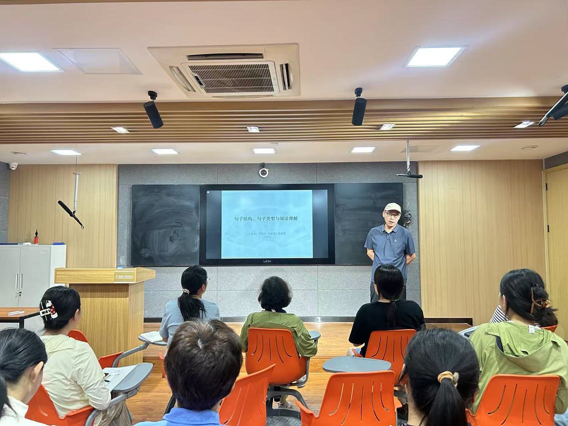 会上,李腾宇老师首先介绍了他在实际教学中的具体实践,指出学生在四、六级英语和考研英语阅读理解部分中的瓶颈,强调熟练掌握句子结构和句子类型对阅读理解的重要性。随后,李老师列举课文实例,从学习方法、练习模式等多角度详细讲解了英语句子结构和类型。