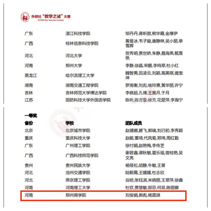 近日,2025年外研社“教学之星”大赛全国复赛圆满落幕。我院刘俊娟、郭彪、杨嘉琪三位老师组成的教学团队,凭借精妙的教学设计、对大赛主题的深刻解读及创新性实践,斩获理解当代中国英语类专业组全国复赛一等奖,充分彰显了我院教师队伍的教学素养与专业实力。