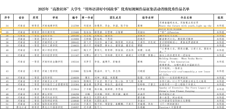 8月12日,由高等教育出版社承办的2025年“高教社杯”大学生“用外语讲好中国故事”短视频作品比赛发布获奖名单,我院翻译专业张佳怡、郭恩睿、孙雪晴、汪智豪同学团队的参赛作品《“彩”出Passion》在别韶冰老师的指导下,荣获省级特等奖。