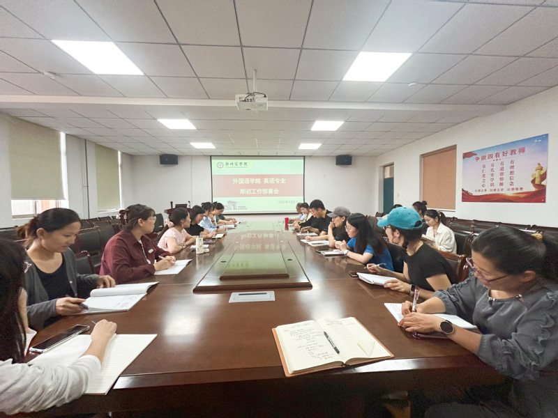 为确保新学期各项工作有条不紊地推进,2025年9月8日下午,我院英语专业教研室在外语大楼W209召开了2025-2026学年第一学期期初工作部署会。会议由教研室主任李晓丹主持,副院长曹晓晨出席会议并分享思路,英语专业教研室全体无课教师参加。