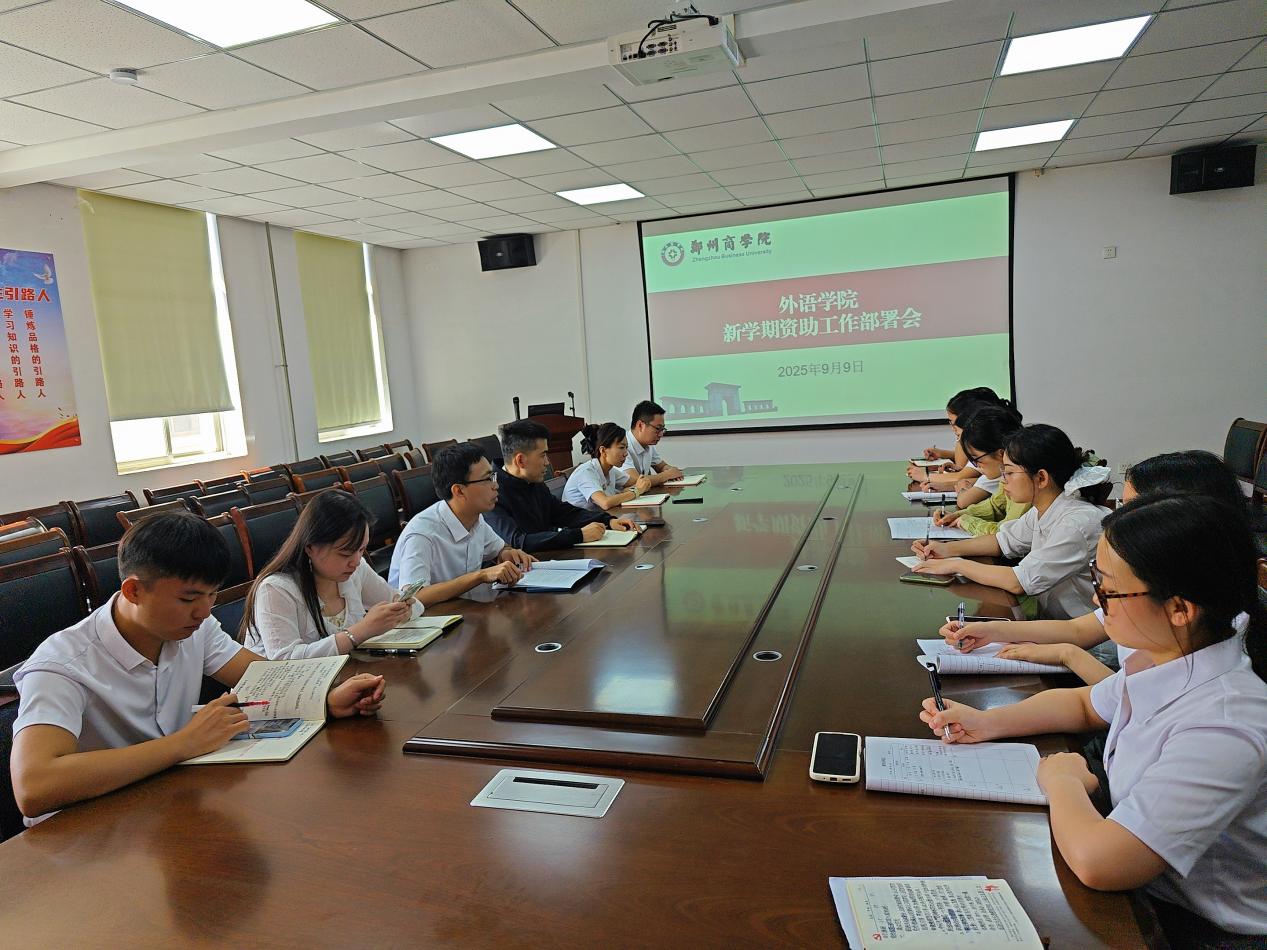 9月9日,外语学院在209会议室召开了2025-2026学年新学期资助工作部署会。本次会议旨在确保学院资助工作精准、高效开展,为家庭经济困难学生提供有力支持。学院党委书记王克志、团委书记王子浩、资助专员钟佳音及全体辅导员参加会议