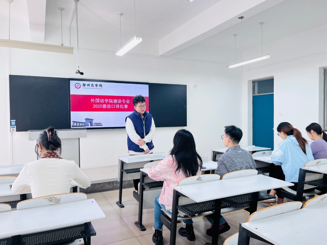 为深化德语口译实践教学,切实提升学生语言转换与跨文化应用能力,我院德语专业于9月29日在外语楼303教室成功举办了2025年德语口译比赛。本次比赛依托德语口译实训课程,围绕“春节习俗、现代农业、中德合作、中欧关系、欧元政策、教育改革、环保技术”等多元主题展开实战演练。22级16名学生踊跃参赛,日语与德语教研室主任魏广龙,德语专业教师侯聪聪、赵琦、游冬冬和高玮担任评委。