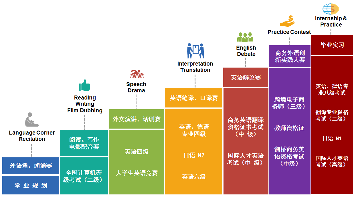 学院以“语言应用和专业实践能力”的提升为主线,持续举办各种专业性活动和竞赛,贯穿学生的四年学习生活,不断引导学生锻炼和提高专业能力。活动包括外语角、多元文化主题讲座、阅读、写作、演讲、辩论比赛、翻译比赛、商务外语实践大赛等,为学生专业能力锻炼搭建了良好的平台。