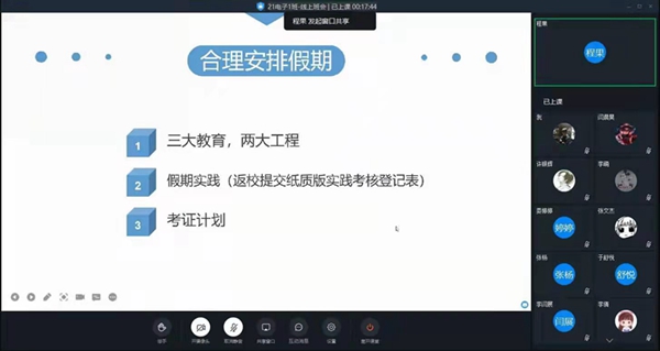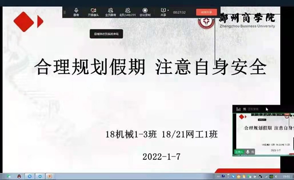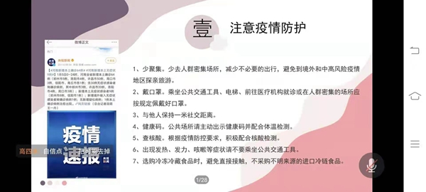 首先,各班辅导员强调,当前疫情防控正处于关键时期,我们一定要提升自我的安全防范意识,筑牢安全思想防线。同学们要继续保持警惕心理,科学佩戴口罩,谨记少聚集、戴口罩、勤洗手、多通风等基本防疫要求,牢记常态化疫情防控下的安全防范知识与注意事项,做好长期防护准备,关注时事新闻,不要隐瞒个人行程。我们要以积极的心态面对疫情,不信谣、不造谣、不传谣,坚决维护好前一阶段所取得的来之不易的疫情防控成果,不给疫情防控工作“添堵”! 另外,辅导员老师们也鼓励大家做好假期规划,保持积极的生活态度,多读书、读好书;规律作息,加强体育锻炼,劳逸结合,注重用眼卫生,养成良好的生活习惯,适当参与家务劳动。