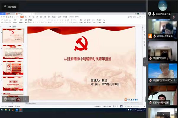为加深我院积极分子对党的认识,端正入党动机,坚定入党决心,从思想和行动两个方面严格要求自己,争取早日加入共产党,我院于2022年3月30日下午19:00,开展线上第三十四期入党积极分子培训班线上党课第三讲,主讲人为我院辅导员张培老师。