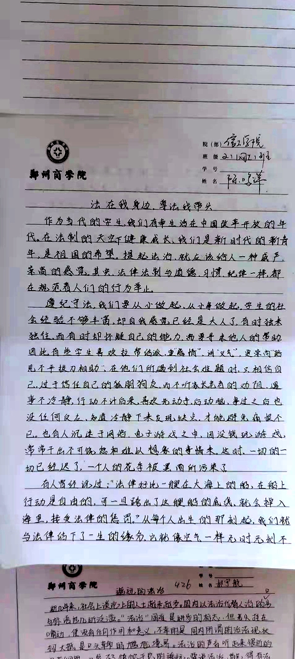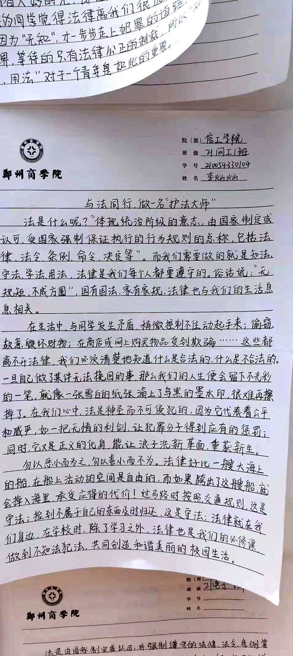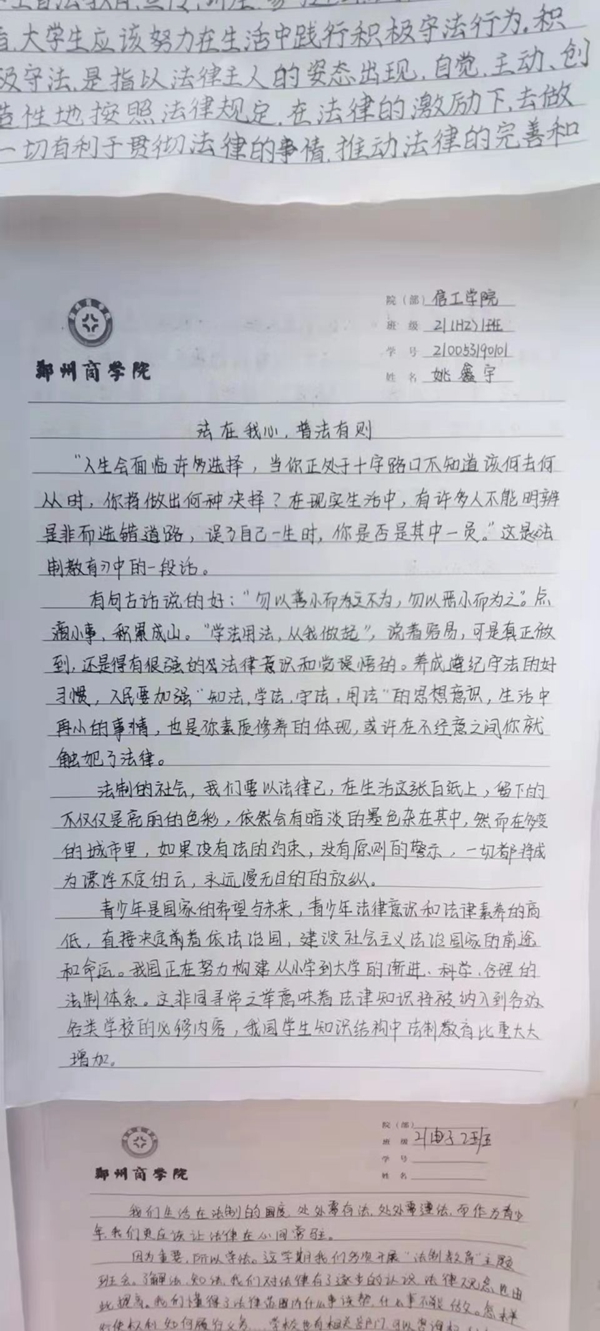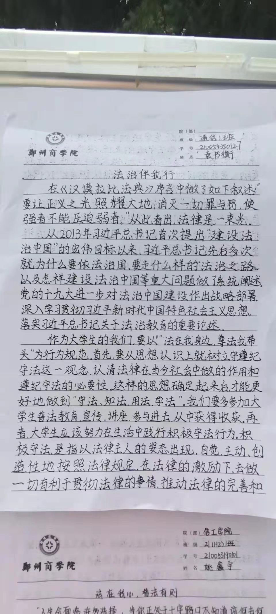 我院于4月18日至4月21日进行以法治教育为主题的征文活动。此次征文共收集投稿210余份,经我院学术部评选出25份优秀作品,并于四号楼下进行展示,以供大家学习交流。