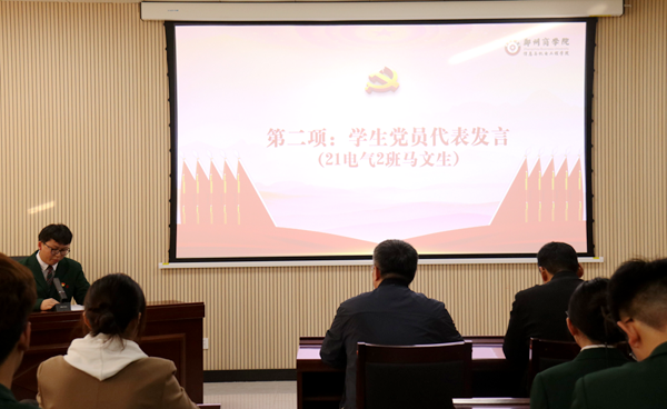 会议在庄严的国歌声中拉开帷幕。首先由学生党员代表21电气2班的马文生同学发言。他分别从保持思想先进、投身社会实践、团结协作向未来三方面诠释了他是如何在实践中做到牢记党员身份,严格要求自己。
