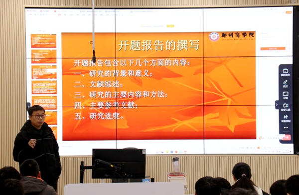 张伟华副院长为同学们详细解析了毕业论文的重要性以及关键节点,对毕业论文(设计)撰写、与导师的沟通汇报等,提出了明确要求,特别是对近阶段要完成的开题报告进行了详细讲解,以确保高质量完成。