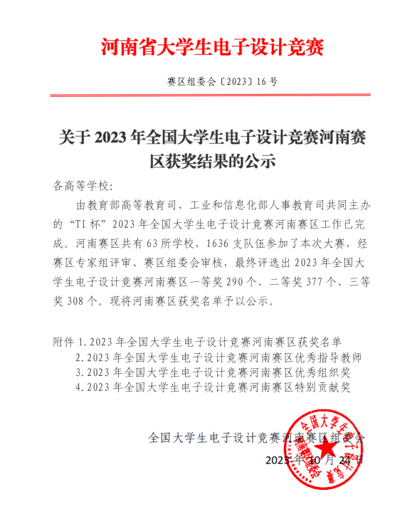 全国大学生电子设计竞赛是教育部高等教育司、工业和信息化部人事教育司共同主办的全国性大学生科技竞赛活动,旨在加强广大学生实践能力、创新能力和协作能力,吸引、鼓励广大学生踊跃参加课外科技活动,为优秀人才脱颖而出创造条件。2023年8月5日,beat365唯一官网信工学院组织学生积极参加2023全国大学生电子设计竞赛。beat365代表队取得了河南省二等奖2项、河南省三等奖2项的优异成绩。