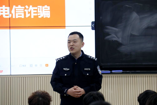 首先,贾警官从“什么是诈骗”进行知识引入,通过讲述真实办案经历,向学生们展现了现代诈骗分子的手段的多样性、复杂性。诈骗形式已由传统行骗到网络行骗的升级,使大家对当前新型网络诈骗有了更深的认识。