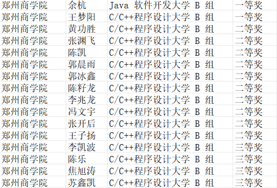 4月29日,大赛组委会发布本届河南赛区获奖名单,我院代表队在C/C++程序设计、Java软件开发、单片机设计与开发、嵌入式设计与开发等项目中,我院蓝桥杯团队在河南省省赛中表现优异,获得省级一等奖5人,二等奖13人,三等奖16人。共计34位同学获奖。