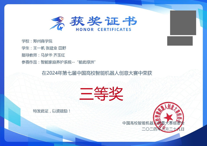 第七届中国高校智能机器人创意大赛于2023年12月启动,全国共有585所高等院校的7086支参赛队伍报名参赛。大赛采用区域赛和全国赛两级赛制,历经9个月,2024年8月22日在浙江余姚完成全部赛程,本届大赛评出全国一、二、三等奖作品共1342项。其中信工学院“智能家庭养护系统--“植此绿洲””作品获得全国大赛三等奖。