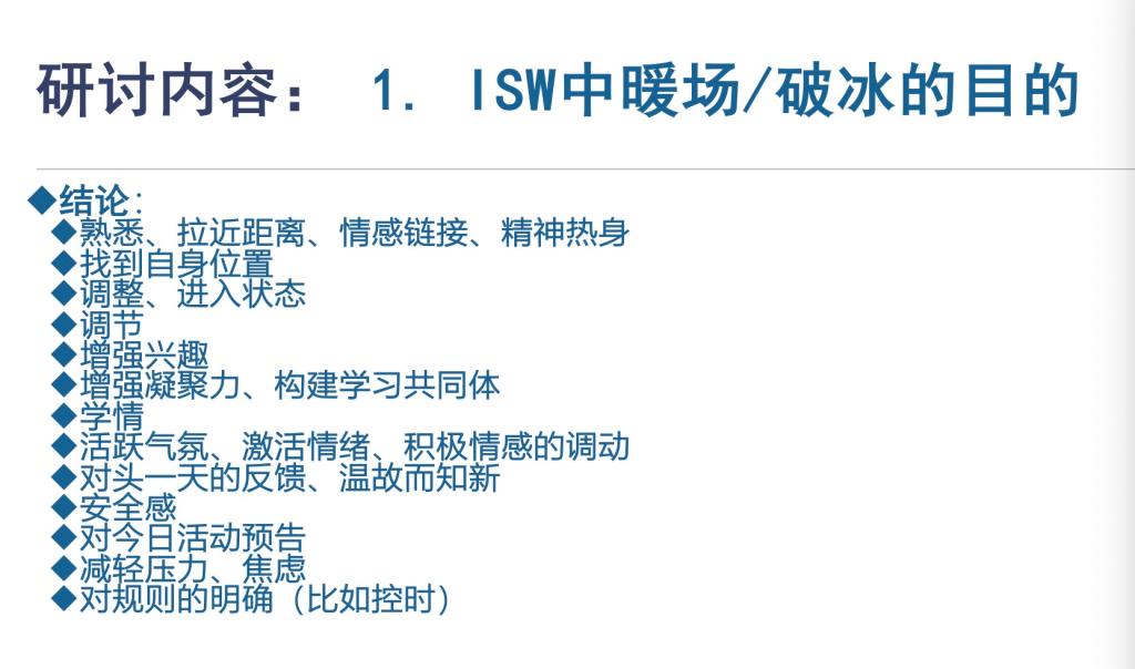 此次研讨聚焦于ISW(InstructionalSkillsWorkshop)教学中的暖场和破冰环节,共进行了三轮要点研讨。