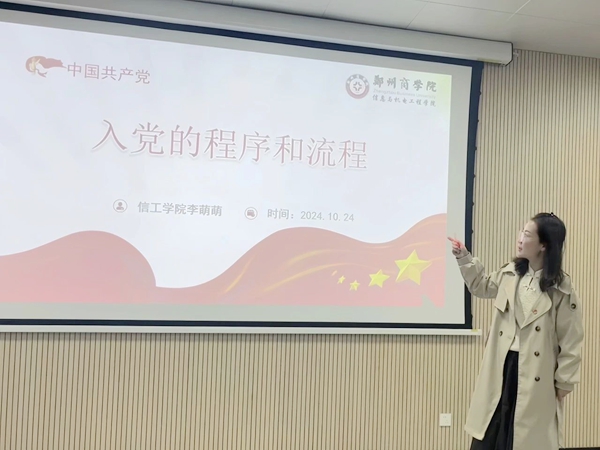 为保证党员发展质量,增强积极分子的归属感和使命感,端正积极分子入党动机。信工学院于2024年10月24日在信工大楼会议室开展第三十九期入党积极分子党课第四讲。本次党课主题为“入党的程序和流程,”由学生第二党支部书记李萌萌老师讲授,第三十九期全体积极分子参加。