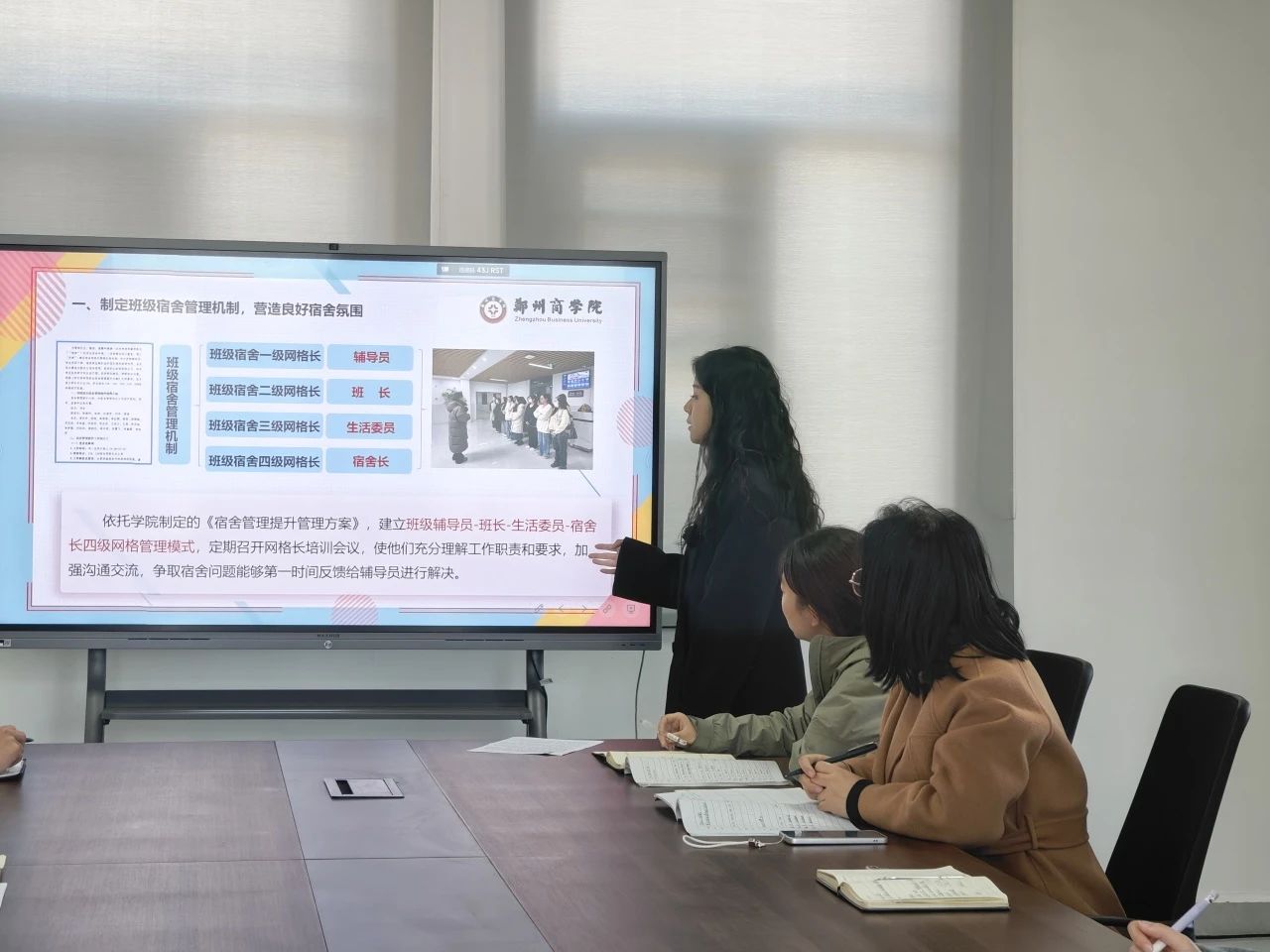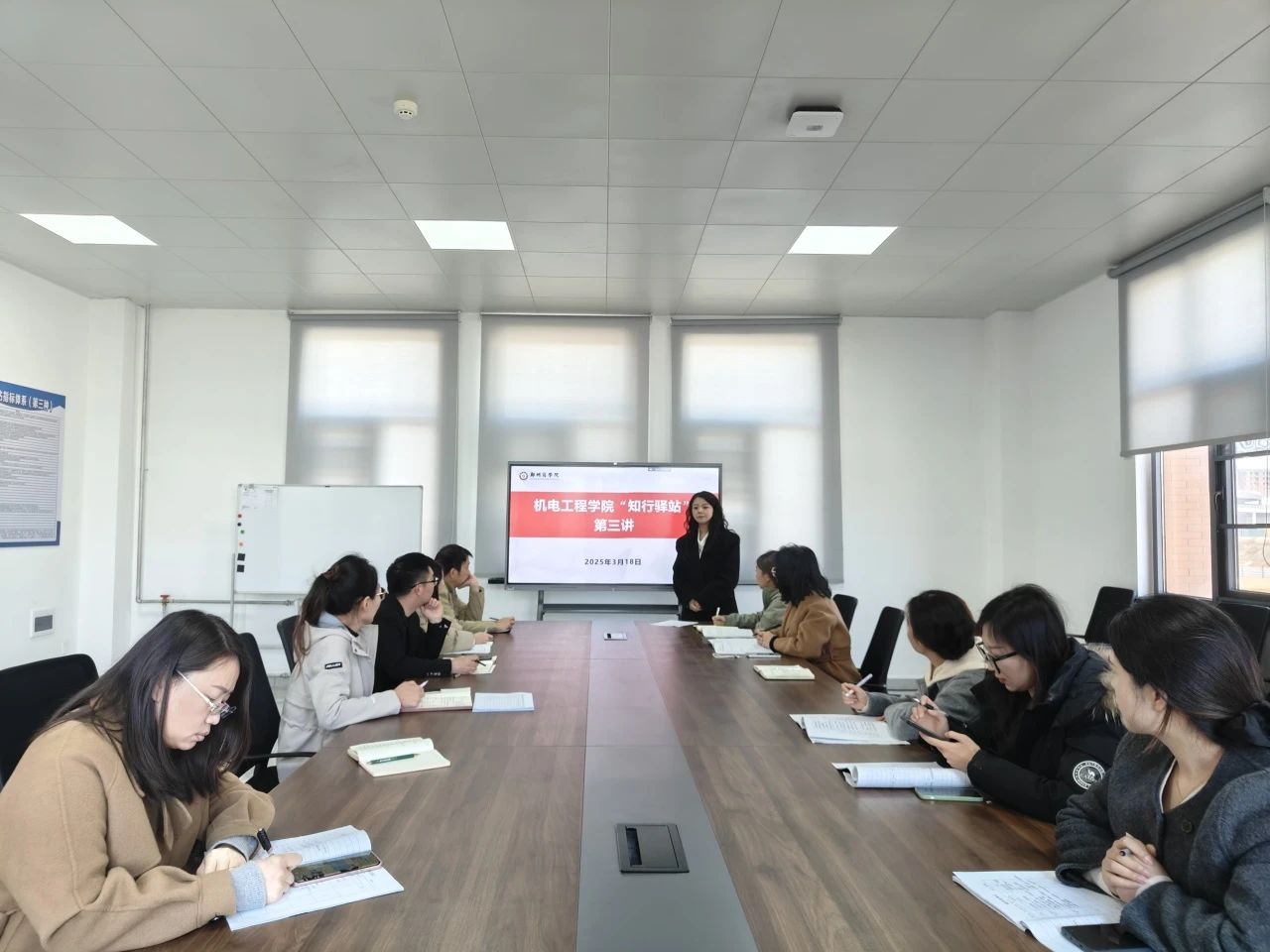 为进一步提升学生工作管理水平,提升辅导员履职能力,推动我院育人工作发展,全面助力学生成长成才。3月18日,机电工程学院在信工大楼3楼会议室召开“知行驿站”第三讲。本次培训由杨瑞瑞老师围绕“学生宿舍管理”为主题展开,全体辅导员参加。