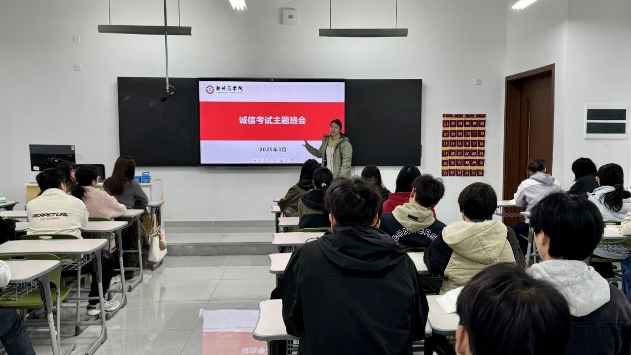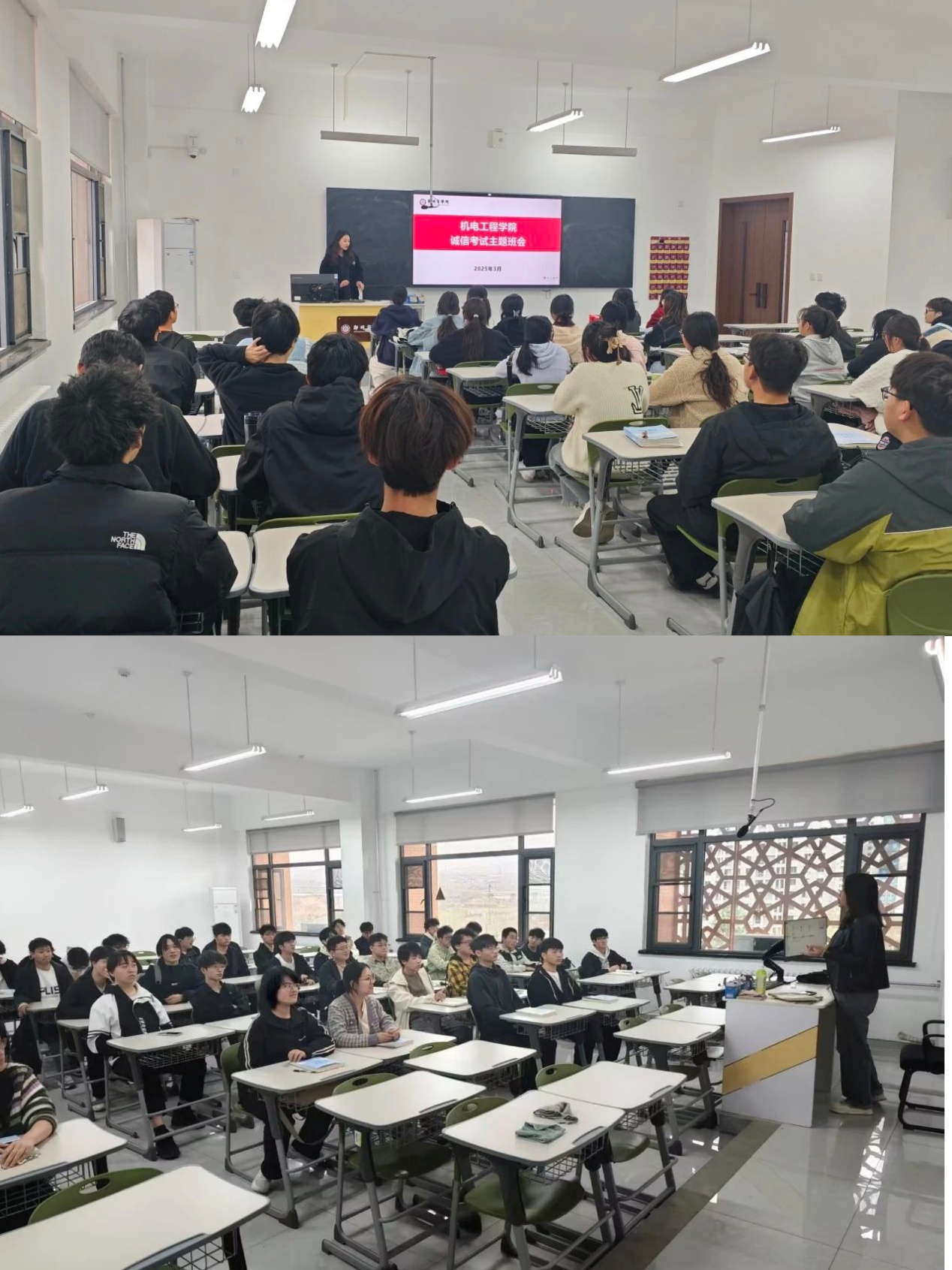 为深入推进学风建设、强化考风考纪意识,3月28日下午,机电工程学院组织各班级召开“树诚信学风·做笃实青年”诚信考试主题班会。各班辅导员紧扣考风考纪要求,系统讲解《考场纪律规范》及学术诚信准则,重点明确“携带通讯工具”、“考场内非必要交流”等高频违规行为的界定标准与相应处分措施,强化责任意识。