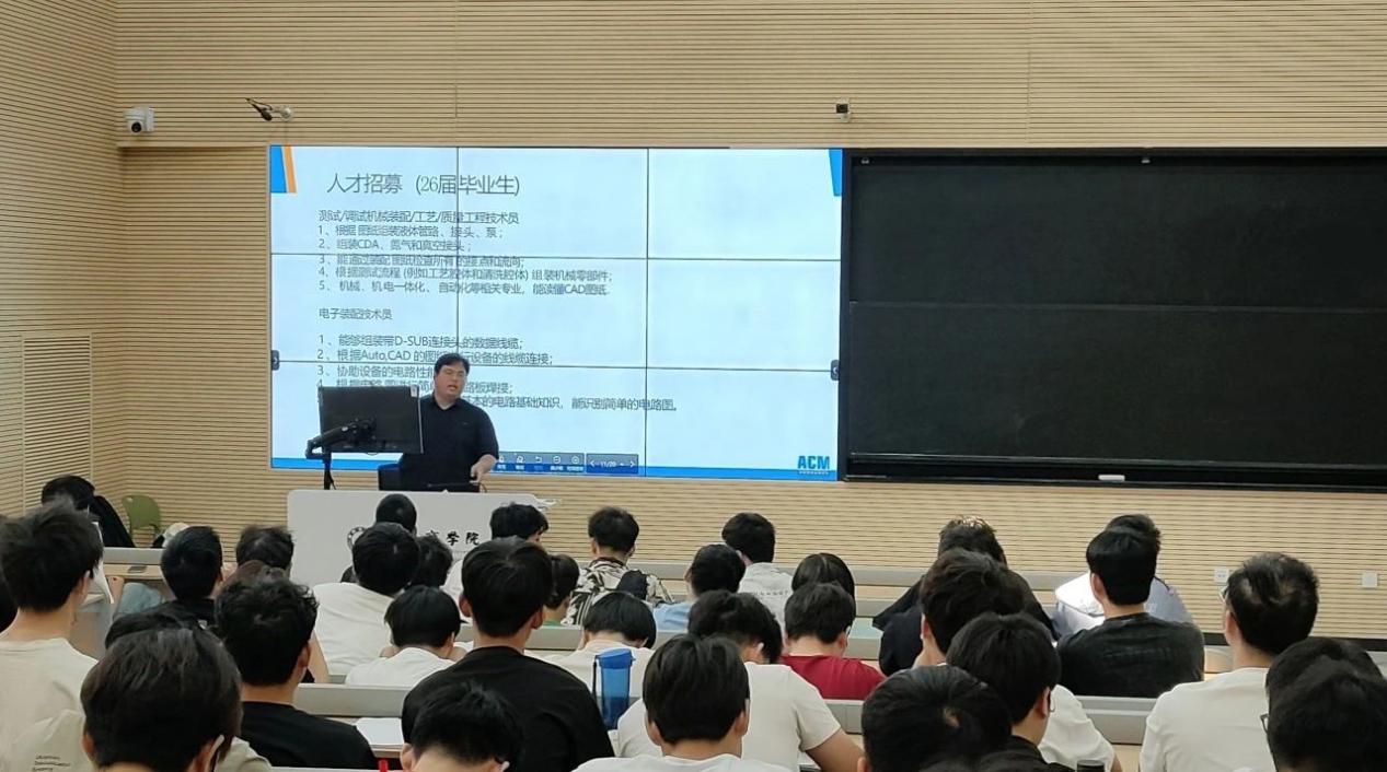 为助力2026届毕业生提前规划职业路径,5月26日下午,盛美半导体股份制有限公司26届实习生招聘宣讲会在机电学院躬行楼JT201顺利举行。盛美股份招聘专员沈董宇携团队到场,围绕企业实力、实习岗位及成长保障展开详实讲解,为现场学子送上一场“产业适配、成长清晰”的职业指南。