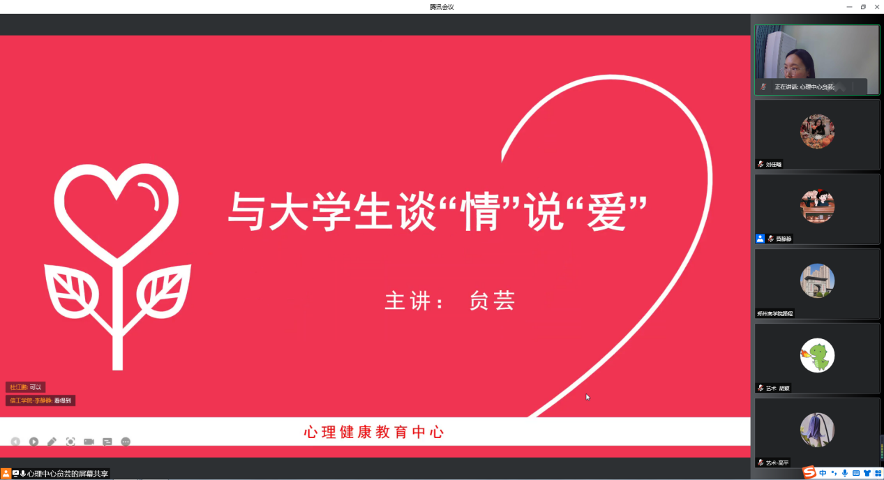 为端正学生恋爱动机,引导学生正确处理恋爱中的问题,养成文明恋爱习惯,4月8日下午,心理健康教育中心组织开展线上爱情主题班会培训。心理健康教育中心贠芸科长主讲,各院部辅导员参加。