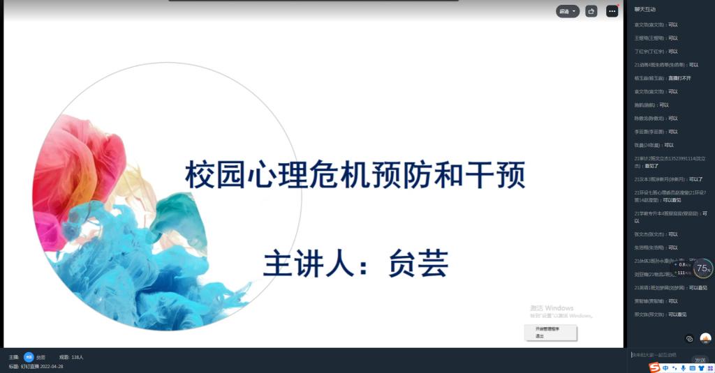 4月28日下午,心理健康教育中心针对21级心理委员开展了校园心理危机预防和干预技能培训,此次培训由心理健康教育中心贠芸老师主讲。