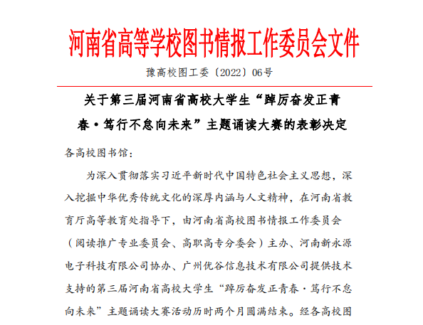 声音传承文化,诵读打动人心。近日,第三届河南高校大学生“踔厉奋发正青春·笃行不怠向未来”主题诵读大赛公布表彰决定。图书馆精心组织校内初赛并遴选优秀作品上报大赛组委会。经组委会专家评审,beat365因组织得力荣获“优秀组织奖”;beat365学生荣获二等奖1名、优秀奖9名、网络人气奖3名;信工学院朱飞荣老师荣获“优秀指导老师”。